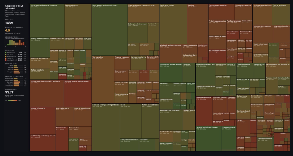 THE NUMBER: 4.9 out of 10 — the average AI automation exposure score across all 342 U.S. occupations, according to Andrej Karpathy’s weekend project. Jobs paying over $100,000 average 6.7. Jobs under $35,000 average 3.4. The people most worried about AI replacing workers are the ones least likely to lose theirs. The people who should be worried aren’t paying attention.